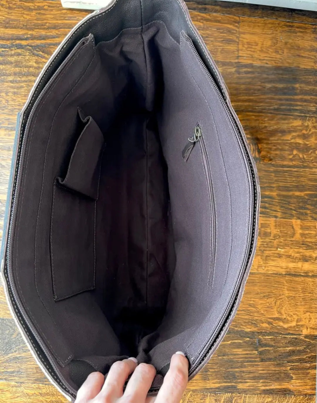 - 2 open pockets inside leather handle, side and back