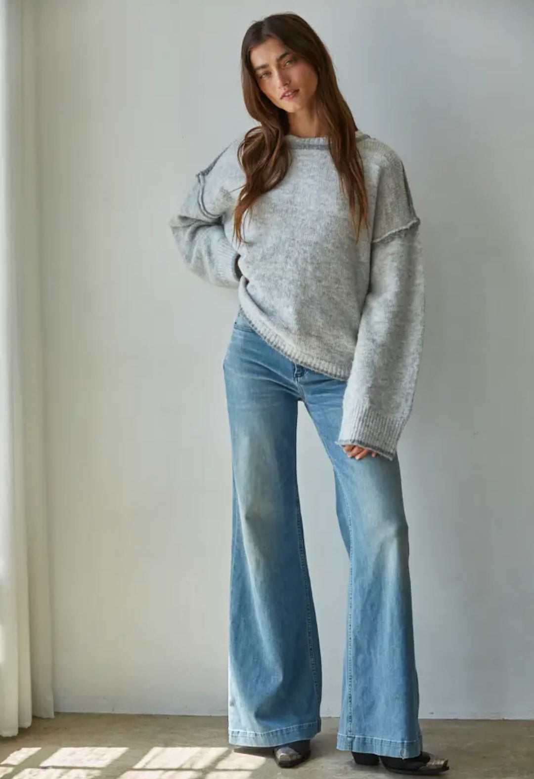 Knit Sweater Crew Neck Pullover Top with Rolled Edge/ Grey