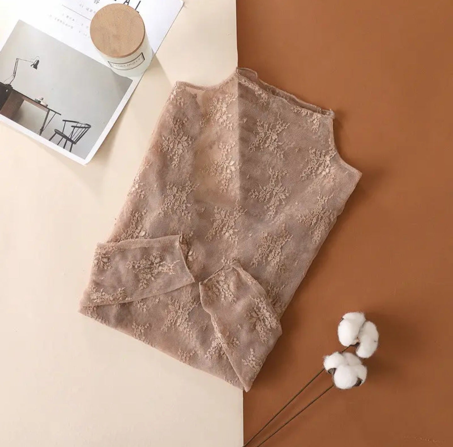 Elegant top with long sleeves, featuring lace and mesh details, perfect for a sophisticated and alluring look and layering.