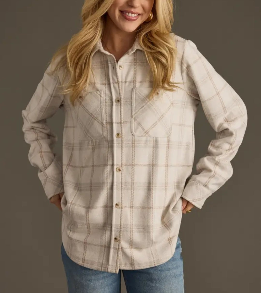 Light tan, brown & gray plaid super soft button up.
