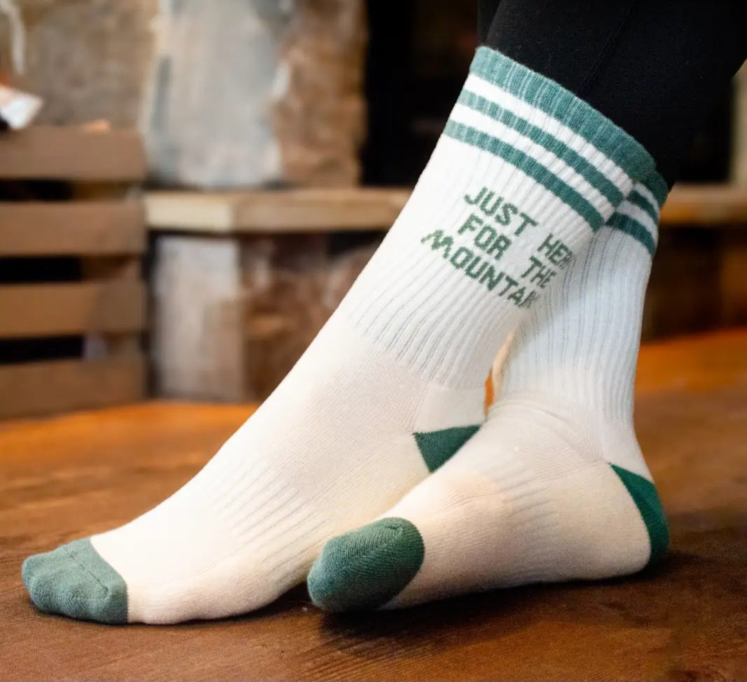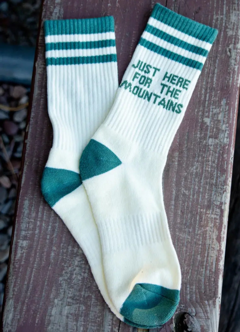 Simple and classic. These cream socks feature the phrase "Just Here or the Mountains". A cozy everydlay pair that pairs perfectly with boots flannels, and fresh mountain air
