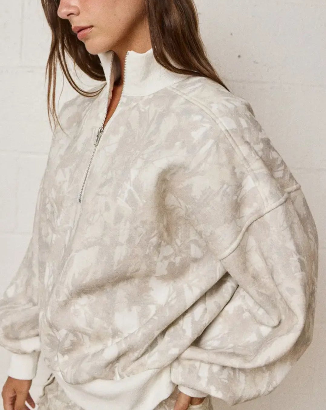 This half-zip pullover is all about chill vibes with its soft camo print and cozy fleece inside. Oversized fit.